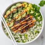 Store leftovers in an airtight container in the refrigerator for up to 2 days. When reheating, gently warm the salmon separately to avoid overcooking, then reassemble the bowl with fresh toppings and sauce. The rice can be reheated in the microwave or on the stovetop with a splash of water to keep it moist.