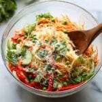 - Combine Greens: In a large mixing bowl, add shredded carrots, sliced bell peppers, cucumber, bean sprouts, chopped cilantro, chopped mint, and green onions. These fresh vegetables provide a crisp and flavorful base for the salad.