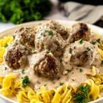 Classic Swedish Meatballs made with lean ground beef, flavorful spices, and a creamy mushroom sauce, simmered to perfection and served over freshly cooked pasta. This comforting dish combines tender meatballs with a rich sauce for a satisfying meal.