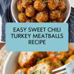 Delicious and healthy Sweet Chili Turkey Meatballs featuring lean ground turkey coated in a tangy and slightly spicy homemade sweet chili sauce. Perfect as an appetizer or a light meal, these meatballs are baked to juicy perfection and tossed in a glossy chili sauce with a kick of sambal oelek and a hint of sweetness from sugar and rice vinegar.