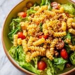 Store the pasta salad in an airtight container in the refrigerator for up to 3 days. For best texture, add fresh lettuce and dressing just before serving if storing leftovers. Reheat is not recommended as the salad is best served cold or at room temperature.