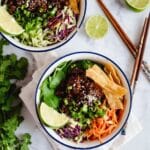 Delicious and vibrant Teriyaki Chicken Wonton Taco Bowls featuring tender chicken coated in a savory teriyaki sauce, fresh crunchy cabbage slaw, and crispy air-fried wonton strips, all garnished with sesame seeds, cilantro, and lime wedges for a flavorful and refreshing meal.