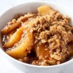 Store leftover apple crisp in an airtight container in the refrigerator for up to 4 days. Reheat individual portions in the microwave or warm the entire dish in a 350°F oven until heated through. The topping will soften over time, so reheating helps restore some crispness.