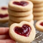 Keywords: thumbprint cookies, heart shaped cookies, jam filled cookies, vegan thumbprint cookies, easy cookies, holiday cookies