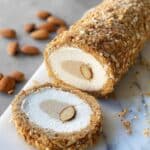 - Coat the Roll: Lightly moisten your hands and the surface of the nougat roll to make it tacky. Roll the entire log in the reserved chopped toasted almonds until evenly coated.
