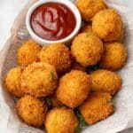 The image shows a basket lined with white paper that looks like newspaper, filled with about a dozen golden brown, round and crispy fried balls. They have a crunchy texture with small green specks inside them. In the basket, near the top center, there is a small white bowl filled with thick red ketchup. The basket sits on a white marbled surface. The scene looks bright and the colors are warm and inviting. photo taken with an iphone --ar 4:5 --v 7