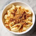 - Combine and Serve: In a large bowl, mix the cooked pasta with the creamy vegan cheese sauce thoroughly. Top with the cooled thyme Panko topping. Serve immediately for a creamy, crunchy vegan mac and cheese experience.