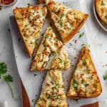 Keywords: Chicken Alfredo Garlic Bread, cheesy garlic bread, chicken appetizer, savory snack, Italian bread recipe