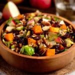 A hearty and flavorful Wild Rice Harvest Bowl featuring nutty wild blend rice, roasted butternut squash, caramelized Brussels sprouts, crisp apples, crunchy almonds, and sweet dried cranberries, all tossed in a tangy and sweet fig balsamic vinaigrette. This nutrient-rich bowl combines warm roasted vegetables and fall flavors for a comforting, gluten-free meal perfect for autumn or any time you crave a wholesome, colorful dish.